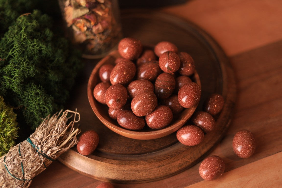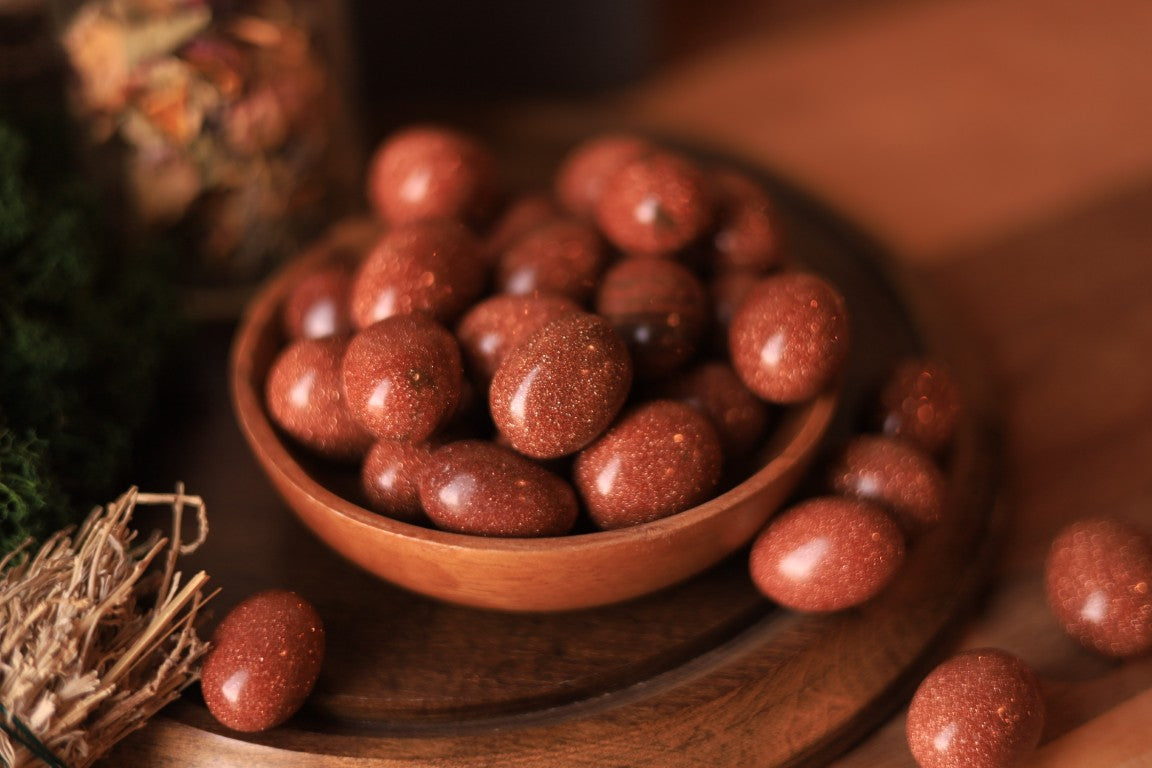 Goldstone associates with abundance, good luck, and alchemy. Thanks to containing copper, it can harmonize relationships and attract abundance and creativity. Goldstone can be a great assistance when it comes to attaining goals and fulfilling ambitions. That's because it has the power of keeping emotions calm and stable, which helps build courage and confidence.